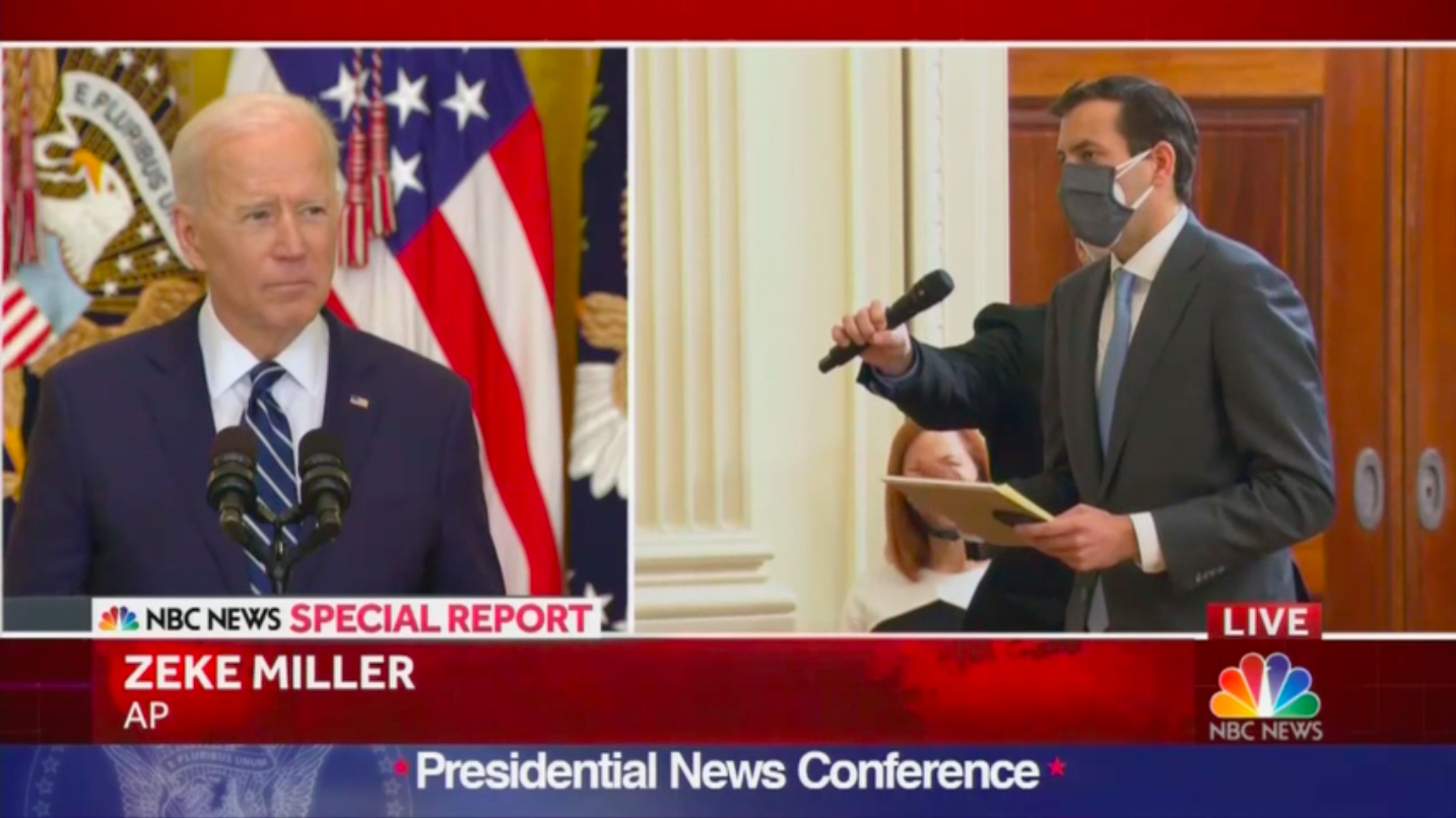 Biden’s staff provided him a list of reporters that began with the Associated Press’s Zeke Miller (and didn’t include the Fox News Channel’s Peter Doocy). Just as he did during Press Secretary Jen Psaki’s first briefing, Miller embarrassed himself: “One of the defining challenges you face in the coming months is how to deliver on your promise to Americans on issues like immigration control, gun control, voting rights, climate change.”