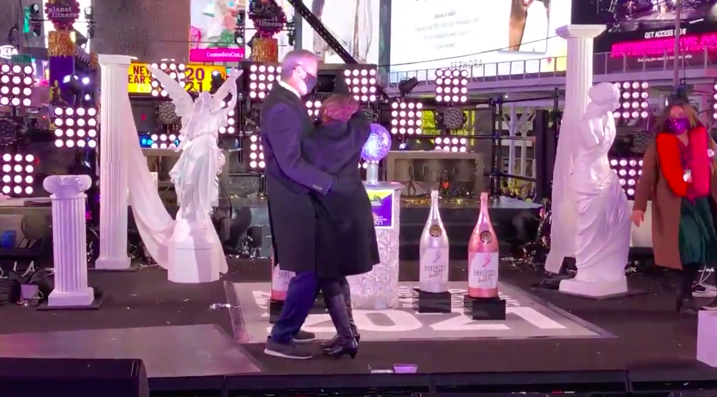 New York City Mayor Bill de Blasio danced with his wife in Times Square shortly before midnight on Thursday after telling New Yorkers to stay away from the area which normally sees thousands of people gathering to usher in the new year.
