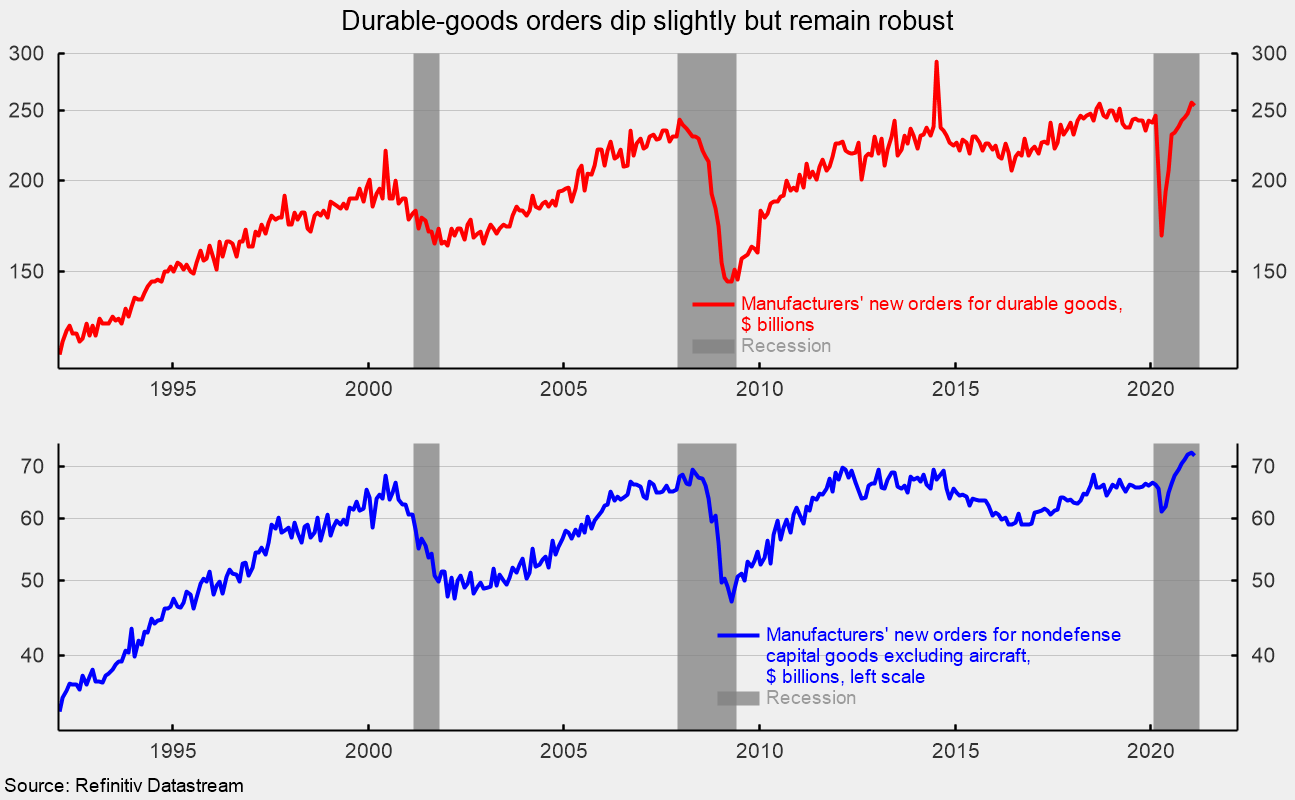 The broad-based declines among new orders for durable goods follow a very strong recovery from the government lockdowns in 2020. The pullback is unlikely to be the start of a period of weakness as other parts of the economy continue to open up in response to the ongoing distribution of vaccines. Overall, the economic outlook continues to improve as government restrictions are lifted.