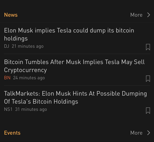 This caused the following headline to hit the Bloomberg terminal: “MUSK IMPLIES TESLA MAY SELL OR HAS SOLD BITCOIN HOLDINGS”.