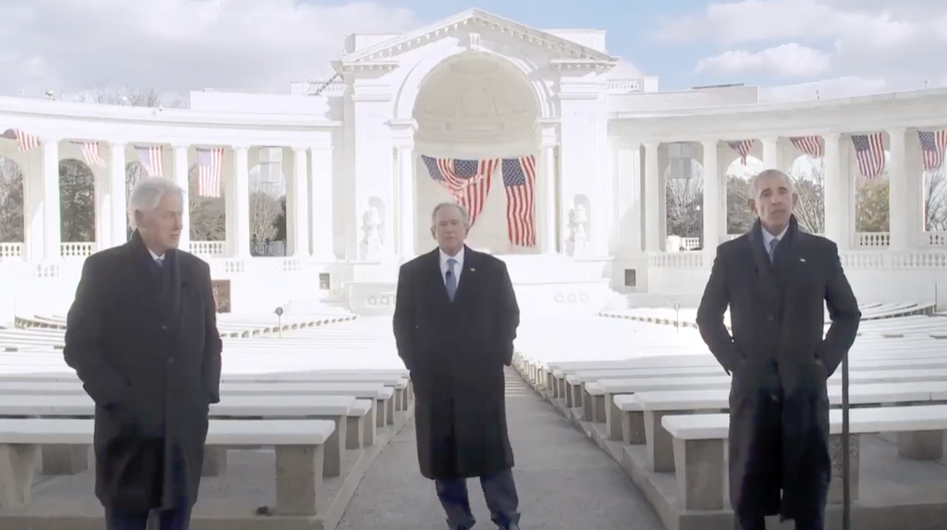 One advertisement posted to YouTube on March 11 featured the three former US Presidents standing alongside one another at the Memorial Amphitheater at Arlington National Cemetery with American flags behind them, swaying in the breeze.
